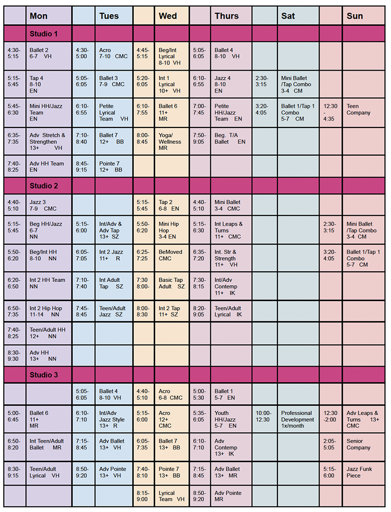 • The schedule is listed on the Summer Intensive Page on the website.  Your dancer should follow the group 1 schedule.